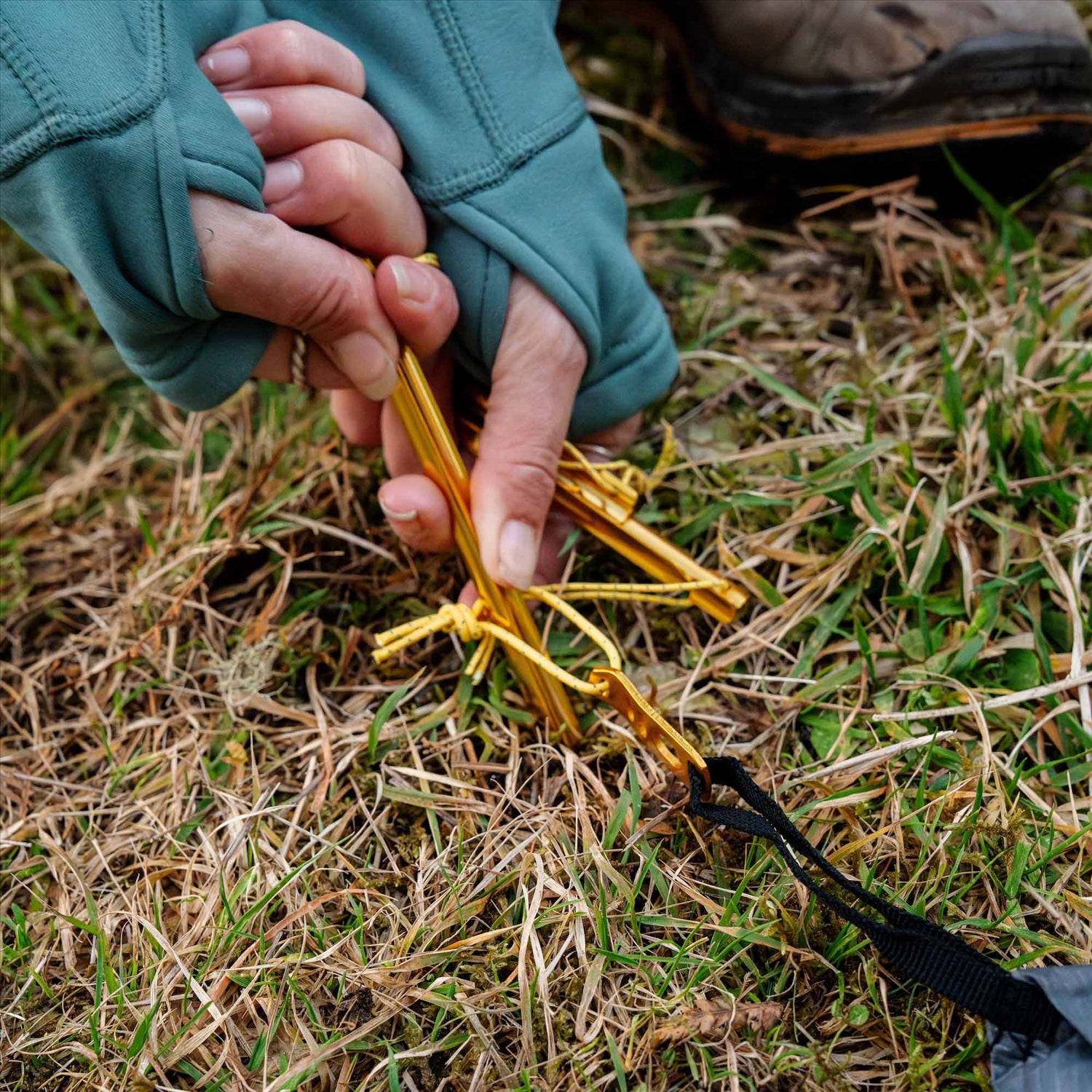 - Aluminium Y pegs, guy ropes with reflector strip attached, with high-viz line locs for easier visibility at night
